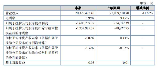 截至報告期末,公司總資產(chǎn)68,342,289.95,較年初增加1.41%、凈資產(chǎn)51,374,475.89較年初減少3.03%。報告期內,營(yíng)業(yè)總收入20,329,475.40元,較上年同期減少11.65%,營(yíng)業(yè)總成本19,117,722.44元,較上年同期下降8.24%,凈利潤-1,603,239.79元,較上年同期減少702.21%。?