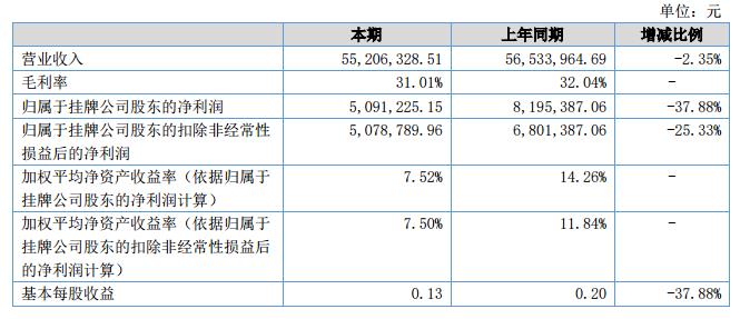 報告期內,公司實(shí)現營(yíng)業(yè)收入5,520.63萬(wàn)元,與上年同期相比減少了2.35%;營(yíng)業(yè)總成本4,979.49萬(wàn)元,與上年同期相比增加0.56%;實(shí)現凈利潤509.12萬(wàn)元,與上年同期相比減少了37.88%。?